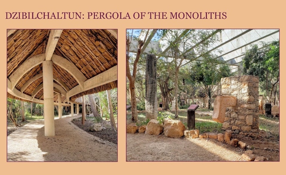 10. PERGOLA OF THE MONOLITHS, MUSEUM DZIBILCHALTUN What Dzibilchaltun lacks in impressive buildings it compensates for by its outstanding display of Mayan sculpture from sites across the peninsula. A shaded walk (on the left) thatched like a traditional "xanil nah" or Mayan house leads to the "Pergola of the Monoliths," a sculpture garden and a indoors museum. (right.) In the foreground is a nose (actually upper lip) from a mask of Chac, the rain god, especially venerated in the arid Yucatan, from the Temple of the Seven Dolls: It is decorated with solar disks and a K'awil, the "mannikin scepter" or "flare" god, a symbol of royal authority carried by all Mayan kings on stelae, attesting to the totemic powers invested in both the stone and sovereign. To its left, is a tall stela from Quintana Roo on the Caribbean (eastern) coast of the peninsula, entirely covered with a calendrical hieroglyphic inscription which dates it to the equivalent of 594 C.E., still during the Early Classic period (300-600)