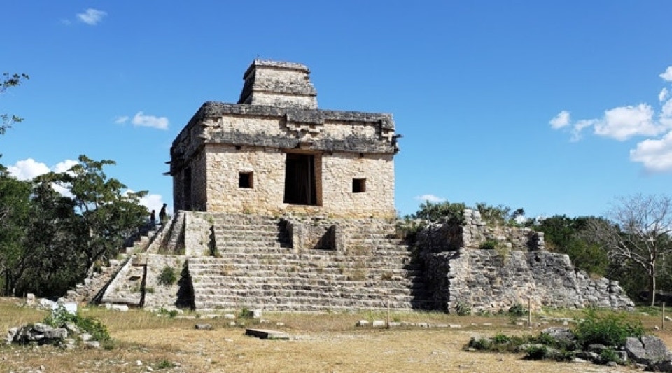 4. TEMPLE OF THE SEVEN DOLLS (TEMPLE OF THE SUN), DZIBILCHALTUN (c.500) When discovered, the temple was entirely filled with rocks and covered by the ruins of larger pyramid built on top of it around 800. Archaeologists removed the later temple but left its terraces on the south to give some idea of its dimensions. The terraces of this third temple were extended to the bottom of the steps of the second on each of its four sides resulting in a Greek cross shape with flights of steps projecting in front of them visible to the right in this photo.. It required four terraces just to reach the top of the old temple's facade and a fifth to cover the central shaft; the space remaining for a cella would have been quite small. The stonework as elsewhere at Dzibilchaltun is characteristic of the Peten not the nearby Puuc hills.. An idea of what may have been intended is provided by Structure 36, (see slide 8,) in a sense, paired with it at the opposite end of the 1.3km sacbe stretching to the west. It has six terraces but only a single southeast- facing staircase; the third Temple of the Sun may have had just one flight of steps on the south as well.