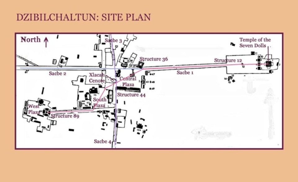 5 SITE PLAN, DZIBILCHALTUN At first glance, the site plan of Dzibilchaltun might seem reminiscent of a Roman castrum with an east-west decumanus, Sacbeob 1 and 2 ( blue) and a north-south cardo, Sacbeob 3 and 4 (lavender) with a forum at their junction (the Central Plaza.) Closer inspection reveals that most lines are not strictly orthogonal; but have a slight "clinamen" or inclination, a characteristic of Mayan scenographic urban design. At Chichen Itza, for example, the eye is led around the site from the ball court around the North Plaza, past El Castillo to the Ossario and Las Monjas in the southern zone, in a carefully staged, unfolding series of views. . At Dzibilchaltun the major temple complex, the Temple of the Seven Dolls ( tTemple of the Sun) is deliberately set off 1.3 km to the west of the central Xlacah Cenote to reorient or extend the site in that direction and provide a theatrical setting for its annual astronomical spectacle. One next notices that the first building at the northeast corner of the city's Central Plaza containing the cenote and leading to its other quarter, the pyramid designated Structure 36, is not only angled to the southwest but juts into the center of the sacbe. This directs attention towards the Temple of the Sun or towards the cenote and Central Plaza depending on which direction one is coming from. Structure 44, a long administrative building like the Honoch-nah at Edzna, forms the plaza's southern side of the Central Plaza moves the eye to the west and the cenote. There another platform angled to the southwest provides the joint between the Central and the smaller, denser and older South Plaza. It in turn points to the plaza's southwest corner and a crowded quadrangle, where another sacbe forms its southern limit. This road leads to a large radial pyramid, Structure 89, which is angled to the northwest, opening onto the large West Plaza. Thus a series of sightlines traces a diagonal (red ) across the city from the Temple of the Seven Dolls in the northeast to the Plaza in the southwest crossing the cenote at the major north south artery (lavender.)